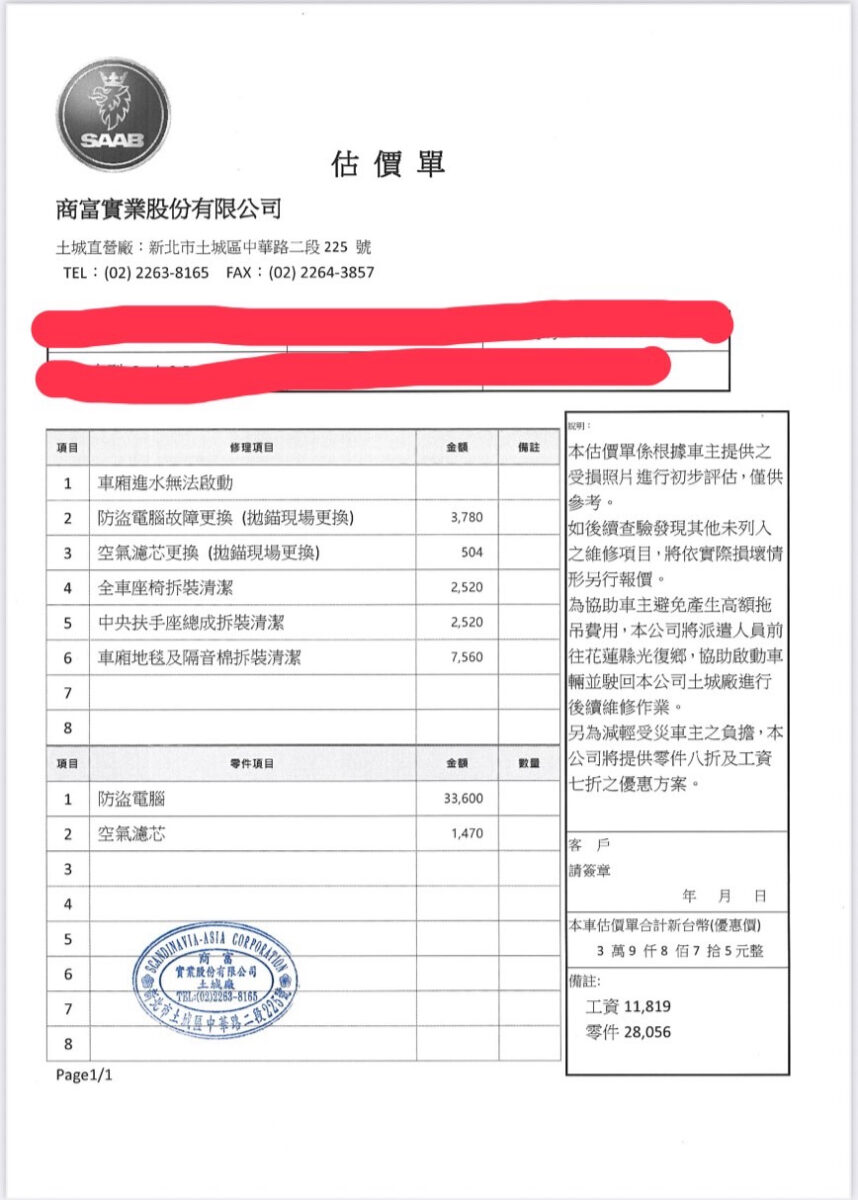兩名技師在泥濘的環境中奮戰約兩小時,頂著烈日、滿腳泥水,終於讓這輛泡水多日的SAAB重新發動。隨後,他們親自駕車北返,全程約6小時,為的就是將車送回土城總廠進行完整清潔與維修。最後,這輛SAAB重新復活,商富甚至給出相當優惠的維修價格,車主也曬出報價單,連本帶工3萬9千餘元。