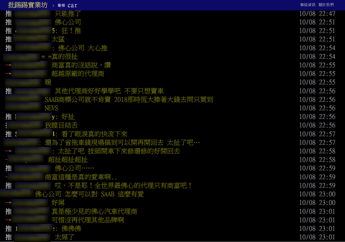 這起事件被車主分享到PTT後,迅速引發網友熱烈討論。許多留言表示,「一家沒車可賣的代理商還願意這樣做,真的難得」、「技師願意從北部開到花蓮修車,太令人敬佩了」。更有車主指出,商富多年對於SAAB車款的用心有目共睹,根本稱得上「慈善事業」,同時也最好的品牌廣告,大喊「如果商富未來代理其他品牌,一定會支持購買。」