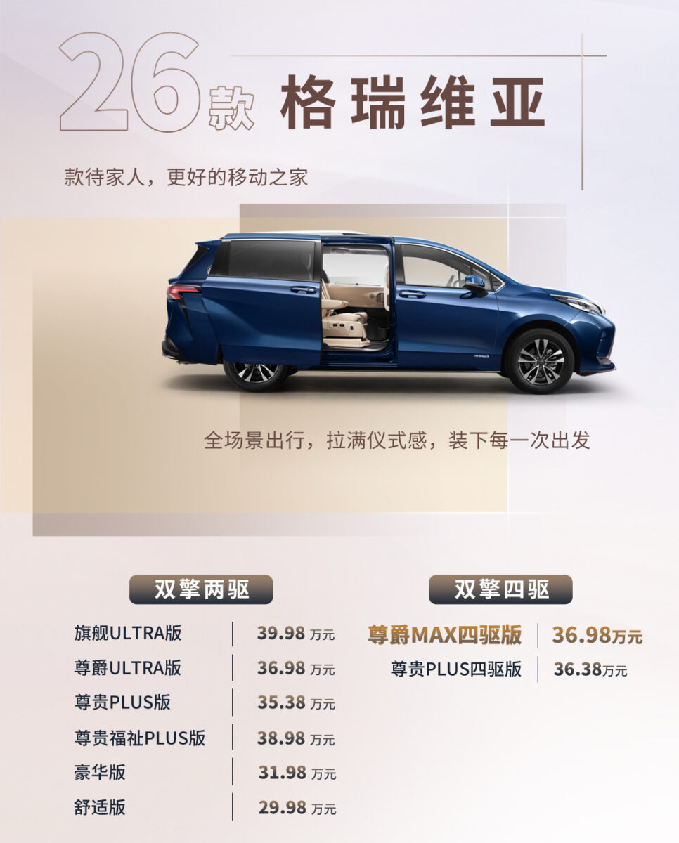 中國發表新年式Sienna雙生車!中國市場中,除廣汽豐田主導的Sienna車系,同步銷售的,還有一汽豐田所溝通的Granvia車系。不過,一汽豐田銷售的Granvia與台灣市場不同,實際上為Sienna在當地的雙生車款,近日,一汽豐田就宣布推出2026年式Granvia,提供更豐富的配備內容,還有有別於台灣的四輪驅動選擇,最低價只要29.98萬人民幣,不用新台幣130萬!
