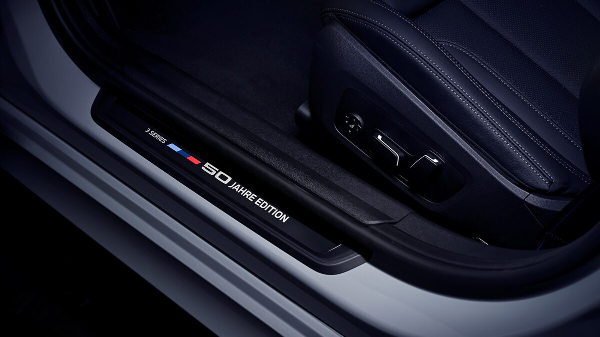 320i Touring 50 Jahre車內更有多項專屬細節,包括專屬3 Series 50 Jahre式樣專屬前門門檻,打開車門就能凸顯3 Series的50年歷史。甚至,不僅運用M款碳纖維飾板包覆儀表台、中控台與排檔座鞍部,過在中控台下方鑲嵌3 Series 50 Jahre專屬銘牌,同樣在車內強化歷史傳承感。同時,保留M款多功能方向盤、M款縫線安全帶等,於320i Touring 50 Jahre車內點綴運動化個性。
