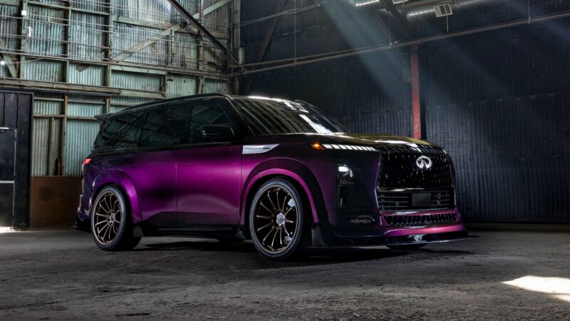 根據Infiniti公布的資訊,QX80 R-spec跟北美限量推出的GT-R T-Spec Takumi Edition一樣,採用會隨著光線變色的Midnight Purple午夜紫塗裝,同時全車加裝了量身打造的空力套件,包含ARP前保桿下擾流、寬體輪拱、整合四出排氣尾管的後保桿分流器,以及同樣相當吸睛的加長型尾翼。還特別比照R35 GT-R加入蜂巢造型前霧燈,24吋金色輪圈造型也是取自GT-R T-Spec Takumi Edition,再配上Yokohama PARADA Spec-X性能胎 (315/35 R24)、帶有黃色卡鉗的碳纖維陶瓷煞車系統、Eibach ERS 短彈簧、MCS訂製避震器等強化操控的改裝部品。
