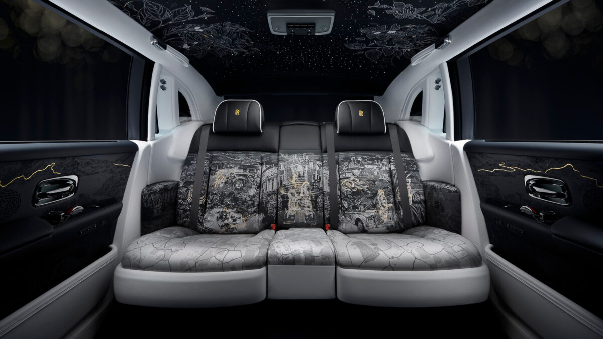 Phantom Century車內更是Rolls-Royce精緻工藝的呈現,車艙使用皮革與織物為基礎,致敬最初前排座椅使用耐磨皮革,後排座椅運用奢華織物的設計理念,凸顯Rolls-Royce處處考量細節的設計手法。Rolls-Royce將Phantom Century後座設計靈感來自於1926年的「愛之幻影 (Phantom of Love) 」,座椅椅背共有三層圖樣,第一層使用高解析度印花工藝,運用油畫風格重現Phantom歷史中的關鍵地點,第二層則同樣使用高解析度印花工藝,並將Phantom歷史中的經典車型烙印在座椅當中。最後再使用刺繡工藝以抽象藝術手法,詮釋Phantom百年歷史中的7位重要車主。
