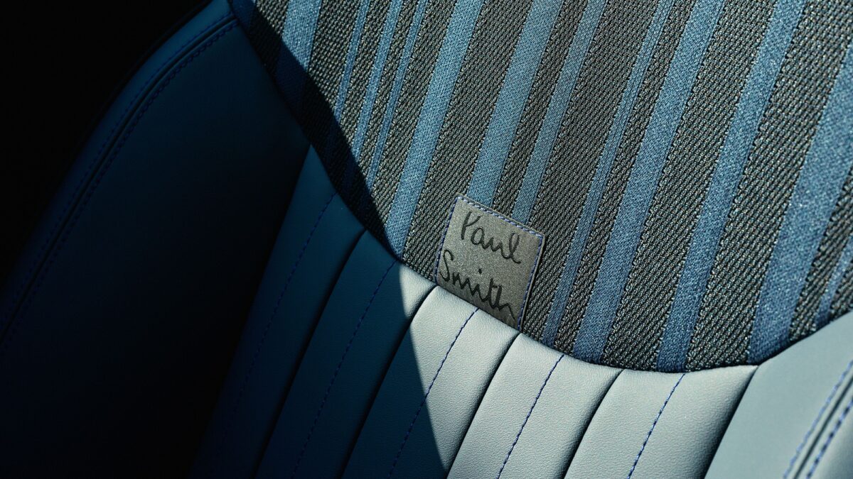 車艙設計延續「英倫典雅與現代玩心並存」的理念,以黑色針織材質覆蓋中控台與門板,靈感取自Paul Smith服裝布料的條紋織紋,Nightshade Blue藍色運動座椅採用Vescin人造皮革與織布拼接,頭枕與肩部區域融入立體針織質感,方向盤中央飾帶則縫上多彩裝飾線,重現Paul Smith「色彩中見細節」的標誌風格。