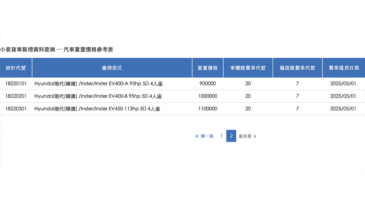 根據保發中心汽車重置價格查詢系統,Hyundai總代理南陽實業共提供了3款Inster車型等級的重置價格,已進行相關的保險費率試算,分別為Inster EV400-A、Inster EV400-B以及Inster EV450等3款,重置價格分別為90萬元、100萬元以及110萬元。其中,最入門的車型設定為90萬元,證實當初Hyundai總代理南陽實業宣布Inster引進計劃時,預告將會開出百萬元內入門價格的宣示所言非假。