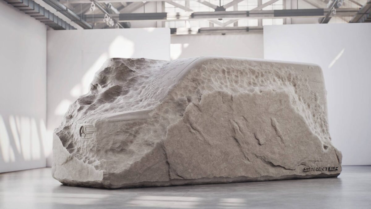 這座長6.5公尺、高2.75公尺、寬2.5公尺的「THE BOULDER」石質造型裝置,以單一巨型材料精雕而成,展現Mercedes-Benz將藝術與工程完美結合的精神,雖然外型仿若石雕,但其實是以科技工法打造的「石紋雕塑」,藉由外觀線條預告全新Sprinter的設計方向,新世代車款將擁有更具力量感的車頭造型、大面積的星芒水箱護罩以及方正的車尾線條,兼顧空氣力學與實用性,象徵商用車的堅毅本質與智能進化的融合。