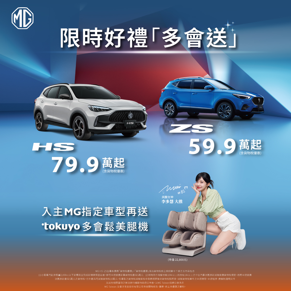 迎接年末購車旺季,MG Taiwan宣布11月購車優惠正式開跑,全車系皆符合新購小客車貨物稅減徵資格,消費者享受政府推動的購車稅賦優惠之外,亦可輕鬆入手兼具安全與質感的超規滿配好車。同時,為回饋消費者熱烈支持,凡於本月入主指定車款,除了提供多項靈活的購車貸款方案可供選擇,更可享有tokuyo多會鬆踝旋美腿機或Panasonic溫感氣動足腿按摩靴二選一,讓車主在享受駕馭樂趣的同時,也能擁有極致放鬆的居家時光。MG以「超規滿配」的產品實力與靈活購車方案,持續提供消費者兼具安全、舒適與價值的理想選擇。