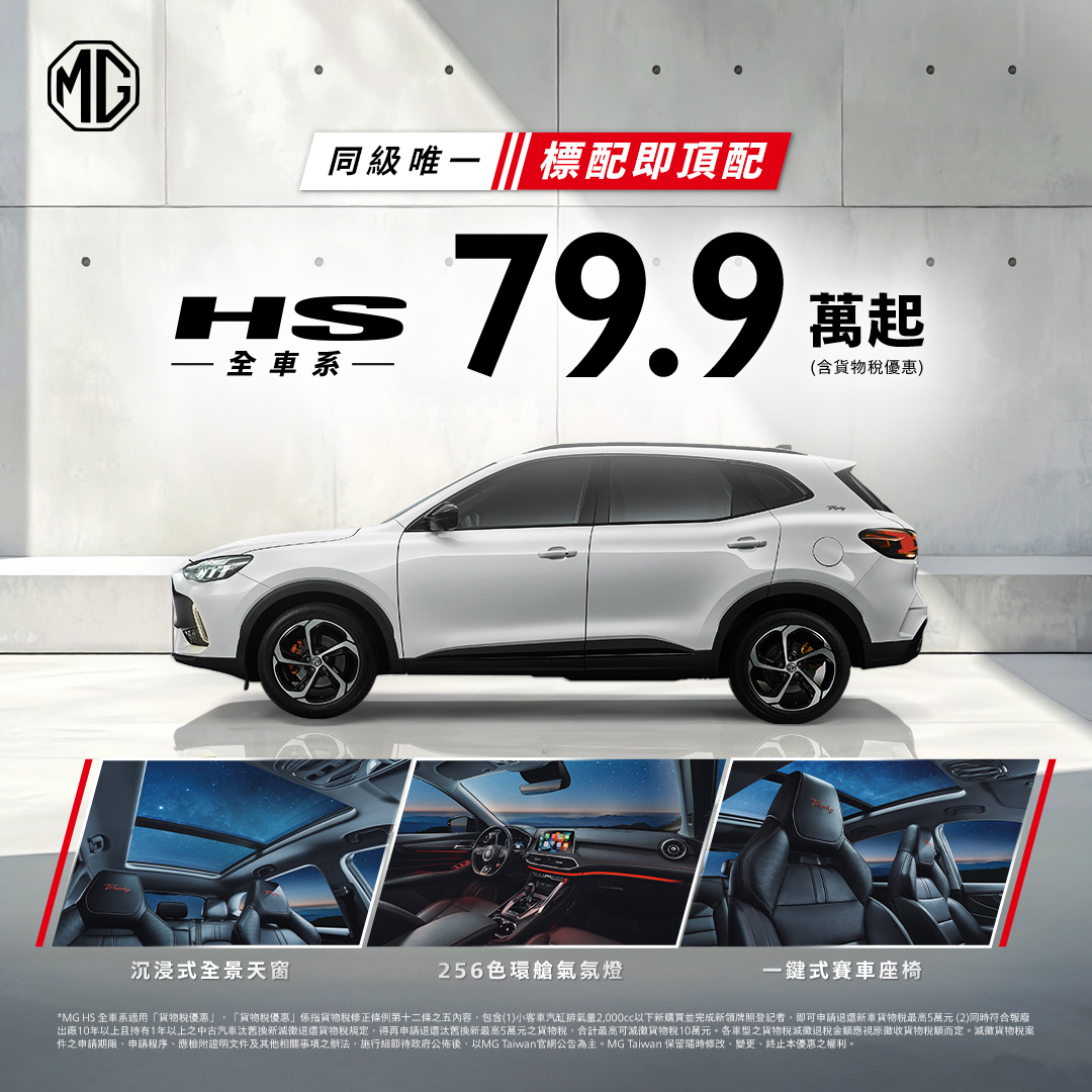 MG Taiwan同步祭出11月旗下多款熱銷車型的限定購車優惠,當家旗艦休旅HS 1.5T搭配貨物稅新購減徵與舊換新補助後,最低79.9萬元即可入主。都會暢銷小休旅ZS 1.5L心動版享補助後最低59.9萬元即可入手。而最親民正七人座MPV車款G50 PLUS,搭配雙重補助優惠後最低僅需98.5萬元即可輕鬆擁有,三大車系同步推出限時購車禮遇,不論是注重動感駕馭、靈活都會通勤,或重視家庭乘載需求的車主,都能在MG找到最契合生活風格的理想座駕。