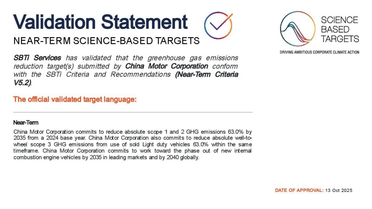 面對全球氣候變遷趨勢,中華汽車宣布在2025年10月正式通過國際科學基礎減碳目標倡議 (SBTi) 近程目標驗證,成為台灣首家通過SBTi的汽車製造商,向《巴黎協定》1.5°C控溫目標展現最直接的承諾。