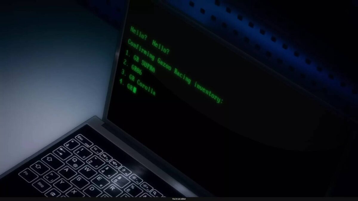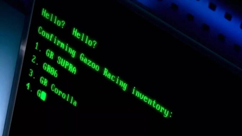 畫面最後出現一段電腦螢幕文字:「Hello? Confirming Gazoo Racing inventory: 1. GR Supra, 2. GR86, 3. GR Corolla, 4. GR …」螢幕隨即黑掉,第四款GR車型名稱被刻意保留未揭露。