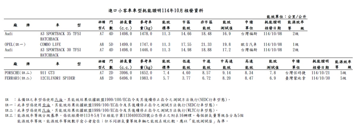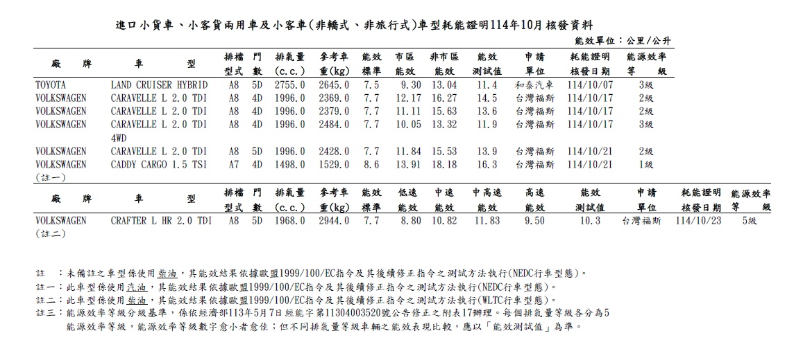 另外台灣剛發表的大改款Toyota Land Cruiser、福斯商旅大改款Caravelle,還有近期上式的福斯商旅小改款Crafter / 新年式Caddy Cargo、新年式Audi A3 Sportback,以及剛到港即將交車的Opel Combo,同樣都在這份油耗送測名單中。