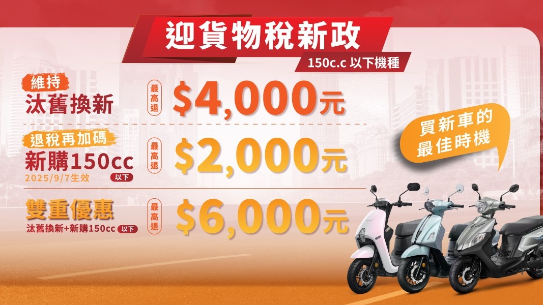 政府推出的燃油機車貨物稅減徵新制規則為,凡購買150c.c.以下燃油機車並完成新領牌,最高可享2,000元貨物稅減徵;若搭配汰舊換新,補助更可拉高至最高6,000元。在補助效益明顯、入手門檻更低的情況下,電動機車的銷售無疑受到一定壓力。隨著年底補助倒數、品牌優惠紛紛推出,電動機車能否在年終前迎來一波買氣?值得持續關注。