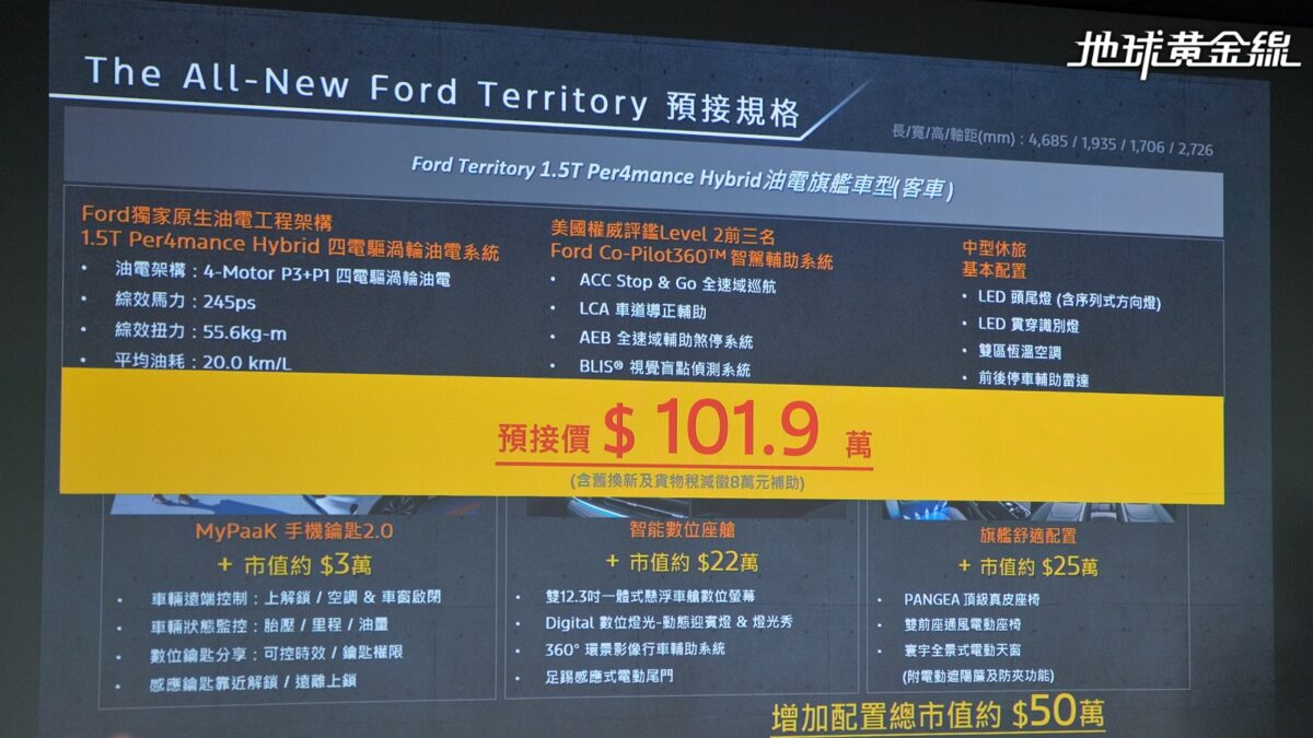 關於售價部分,Territory目前僅推出客車認證的1.5T Per4mance Hybrid油電旗艦車型,預接單價訂在109.9萬元,如果加上汰舊換新貨物稅減徵補助,最低只要101.9萬元,對照同級價位算是相當有競爭力,至於正式售價則要等到上市後才會公布。