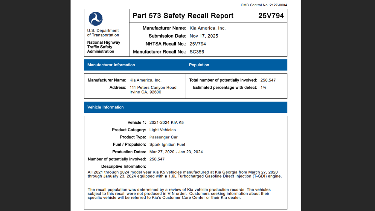 本次召回影響範圍為,搭載1.6升T-GDI渦輪增壓汽油引擎的2021年至2024年式Kia K5,生產期間為2020年3月27日至2024年1月23日,皆由美國喬治亞州工廠製造,而搭載2.5升引擎的K5車型則不在召回範圍內。此外,好消息是,目前Kia表示尚未接獲任何相關事故或人員傷亡的回報。