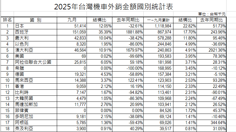 以台灣機車外銷金額排名來看,日本以11.18億元奪下第一名,佔總出口額的22.82%,穩居最大輸出國。西班牙緊追在後,出口額為8.67億元,年增幅高達243.96%,佔比達17.7%,而排名第三為義大利,出口額5.78億元,年成長95.46%,佔比11.8%。以色列排名第四,出口額2.44億元,較去年同期減少36.69%。另外,值得注意的是,澳洲市場表現驚人,出口額2.4億元,年增幅高達2,921.36%,一舉躍升至第五名,顯示台灣機車在特定市場的爆發性成長。