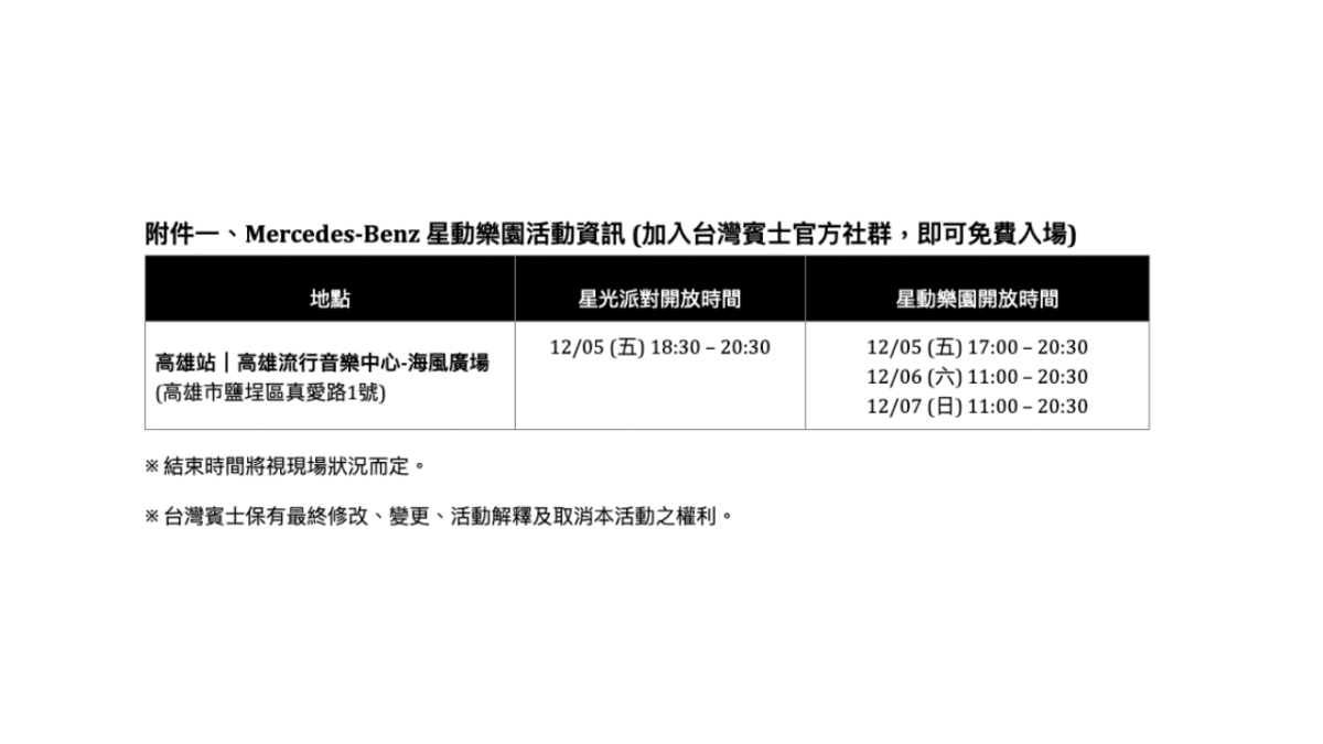 自11月起,《Mercedes-Benz星動樂園》相繼於台北松菸文化廣場與台中國家歌劇院熱鬧展開,以潮流且兼具品牌精神的多元互動體驗,成功累積超過3.5萬名訪客入園,成為年末最受矚目的車壇跨界活動。如今,全台巡迴最終章正式南下,高雄站將於12月5日至12月7日,在高雄流行音樂中心海風廣場壓軸登場。