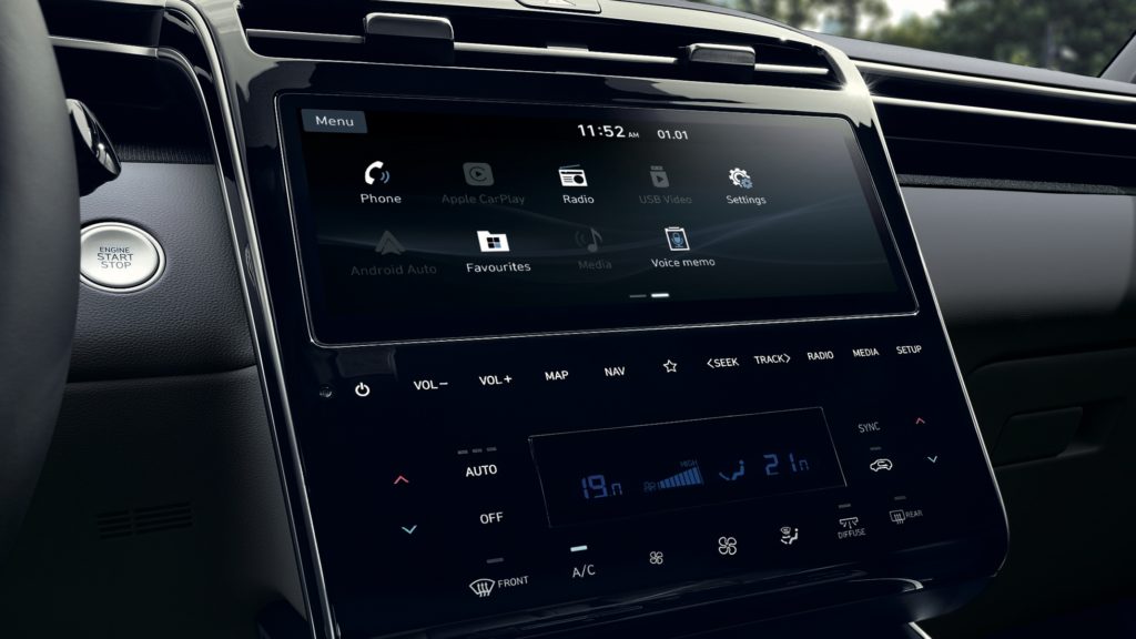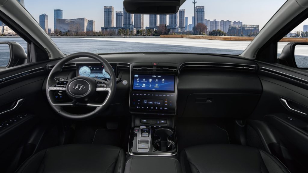 Hyundai Tucson L在內裝呈現上也以大弧度中控台造型呈現,創造出豪華的第一眼印象,另外雙10.25吋液晶顯示螢幕除了可以顯示多方行車資訊外,也能呈現ADAS系統的作動狀態。中央觸控螢幕除了提供倒車顯影功能,也可以使用Apple CarPlay以及Android Auto,創造媲美智慧行手機的使用體驗。Hyundai Tucson L也取消了傳統排檔桿,改以線傳按鍵呈現,帶來更具有科技感的使用感受。