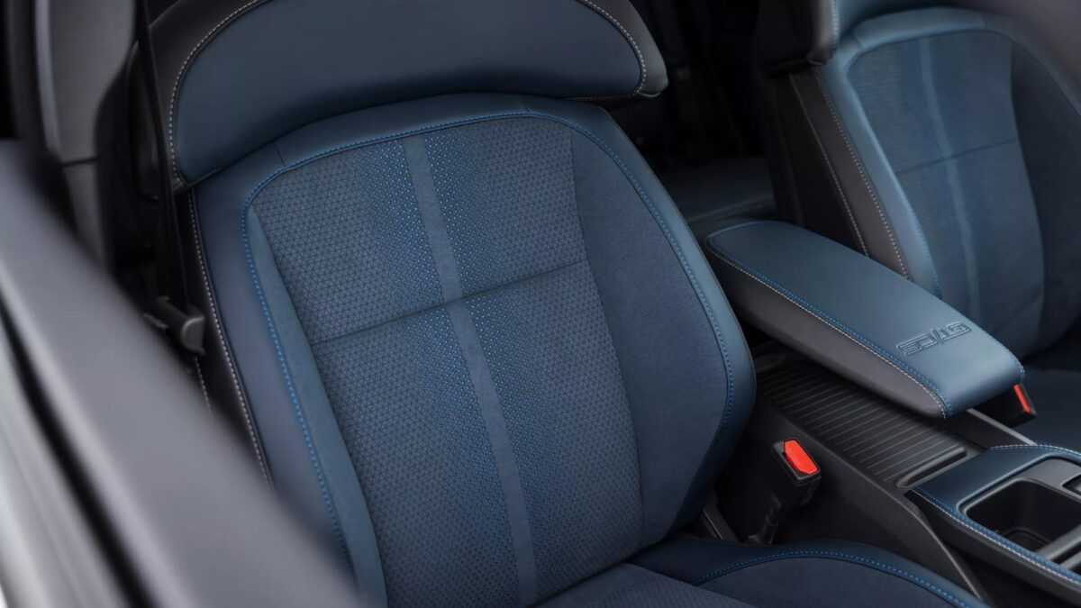 車內同樣以藍色為主軸,在周圍加入藍色皮革與藍色縫線,最大亮點則是前座兩張Navy Pier ActiveX + Miko運動化座椅,由藍色/黑色皮革、點陣纖維面料混搭而成,位於前座中央扶手上的「GT-CS」壓紋字樣,也呼應了California Special套件加持的身份。