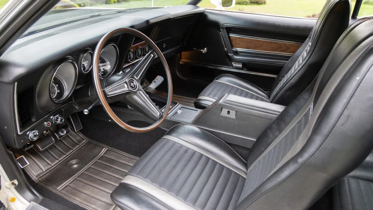 車室內裝更是這輛Mach 1的靈魂,其具備選配的Mach 1 Sports Interior套件,包括黑色高背桶型座椅、編織紋路Vinyl材質、銀色飾條、額外儀錶、亮面金屬踏板、木紋飾板以及成型門飾板等,完全保留當年的工藝風格,中控台同樣採用原廠配置,包含加選的車內中央置物台、Sport Deck可摺疊式後座、電熱後擋玻璃、AM/FM立體聲收音機,以及極為罕見的rim-blow式豪華方向盤,方向盤的喇叭採用邊緣感壓式設計,是70年代Ford的特殊技術,更具趣味的是排檔座後方還留有一塊車主當年製作的小型個人化銘牌,上面的1971年8月16日標示了這輛車的組裝日期。