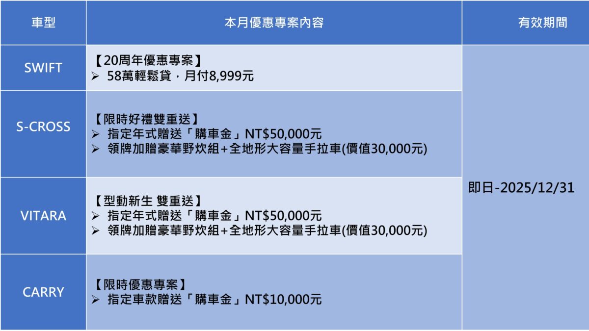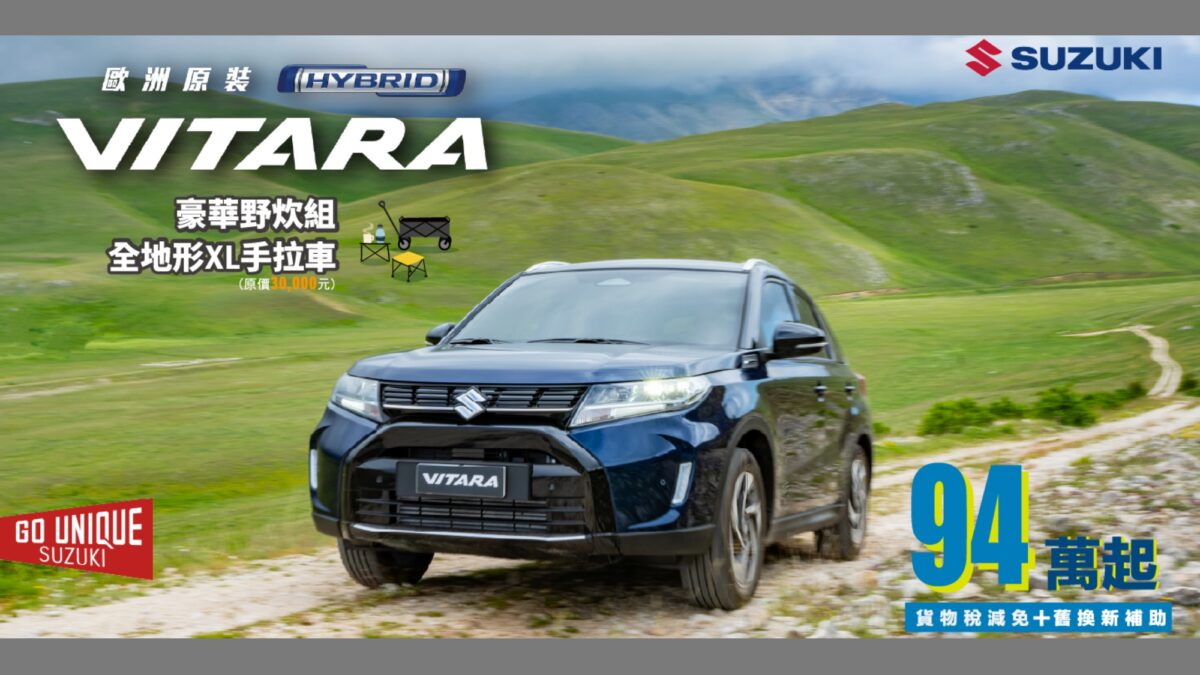 Vitara則持續展現Suzuki深厚的越野技術底蘊,結合靈活的車身設定與全面進化的安全科技,成為喜愛冒險與多元生活風格消費者的熱門選擇。本次指定年式全面升級DSBS II雙感知器煞車輔助系統,並新增LKA車道維持輔助,以及LDP車道偏離輔助等智慧安全配備,讓行車防護更加周延。優惠內容同樣誠意十足,指定年式可享50,000元購車金,領牌後再加贈豪華野炊組與全地形大容量手煞車,讓戶外行程與日常使用一次到位。