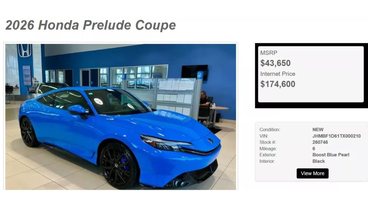 日前美國佛羅里達州一家Honda經銷商Delray Honda/Acura,在Cars.com上架一輛2026年式Prelude時,竟開出174,600美元的售價,換算新台幣約550萬元,遠高於原廠建議售價43,650美元,誇張數字瞬間在網路上瘋傳。