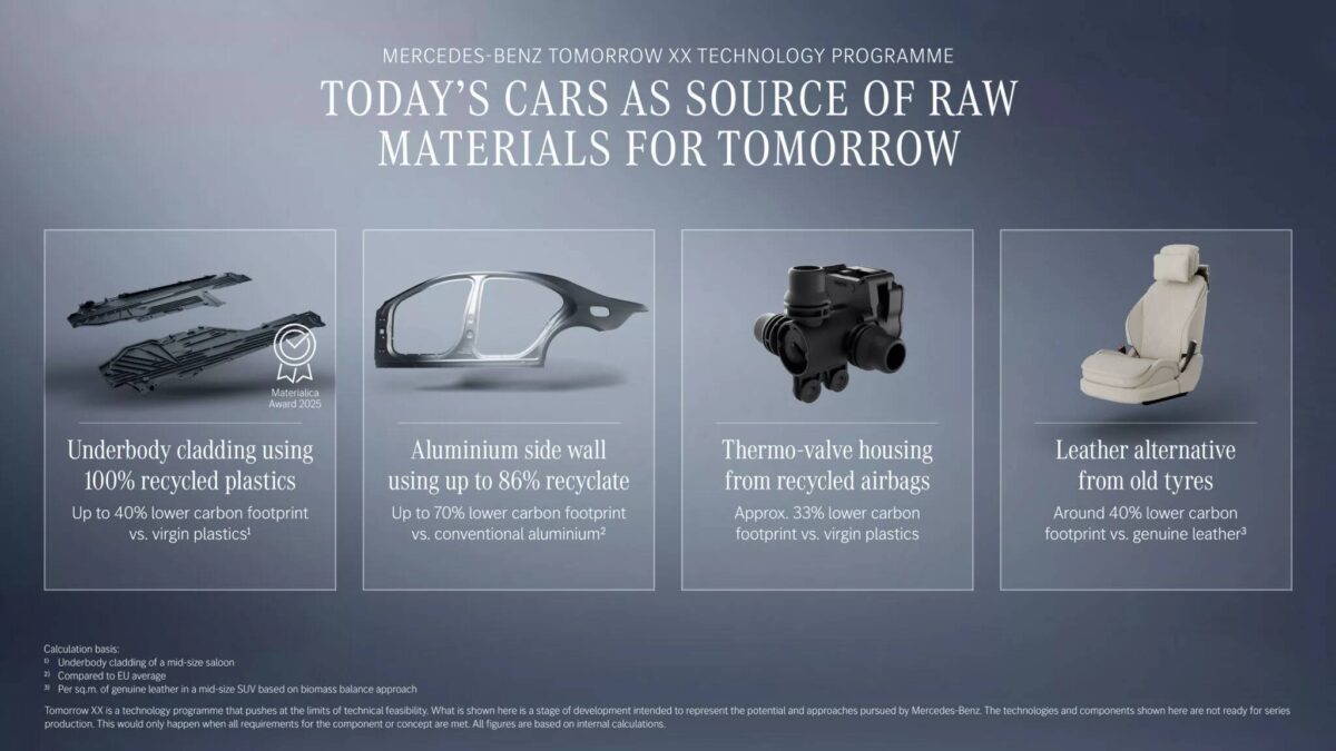 此外,賓士也正在測試更多跨領域回收應用,包括以回收氣囊製成的引擎腳、由舊輪胎轉化而成的隔音材料,以及部分來自再生塑料的合成皮革內裝。單看每一項變化或許不算顛覆,但長期累積,對碳排與資源消耗的影響相當可觀。