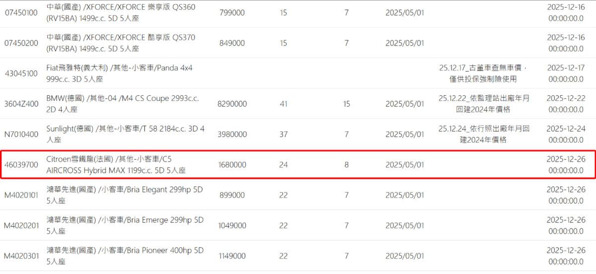 在最近更新的保發中心重置價格資料,出現了Citroën C5 Aircross的價格標示,重置價格為新台幣168萬元。雖然重置價格不代表上市價格,但仍有一定參考價值,而且資料標示貌似還透露提供給保發中心的車型為國外銷售的「MAX」最高規車型,採用1.2升的Hybrid油電動力。