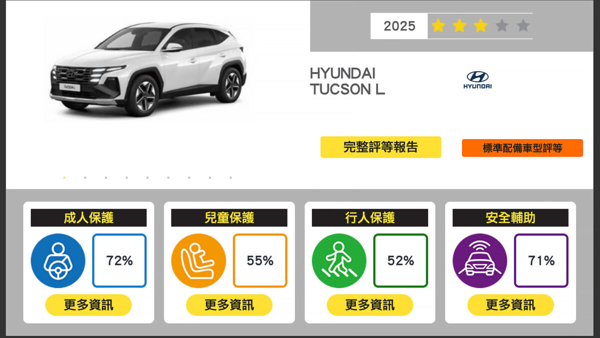 不僅如此,Tucson L於成人保護項目表現亦未能達到五星標準。由於這次受驗車型為GLT-A客貨車版本,最主要影響成人保護項目成績原因在於後座乘客保護。其中後座乘客人偶於執行前方偏置撞擊測試時,胸部遭到嚴重傷害超過規定限制值,因此保護性能被評為不良。同時,後座頭枕因為有效高度不足,容易在遭到後方車輛追撞時讓乘客產生鞭甩效應,因此無法取得分數,保護性能也被評為不良。這樣的結果,讓Tucson L於成人保護項目僅得到72%成績,未達五星所需的80%標準。另外,行人保護也因為屬於車頭正面較為高大的SUV車型,於行人骨盆與大腿保護性能被評為差或不良,導致行人頭部、骨盆與腿部整體保護性能分數並不理想,因此,即便緊急煞車輔助系統在大多數試驗情境都能避免碰撞或者減輕傷害,仍無法在緊急煞車輔助之弱勢道路使用者系統項目取得分數,也僅能獲得四顆星成績。由於Tucson L於兒童保護項目僅取得三星評等,依照TNCAP的星級評等標準,僅能拿到三星安全評價。