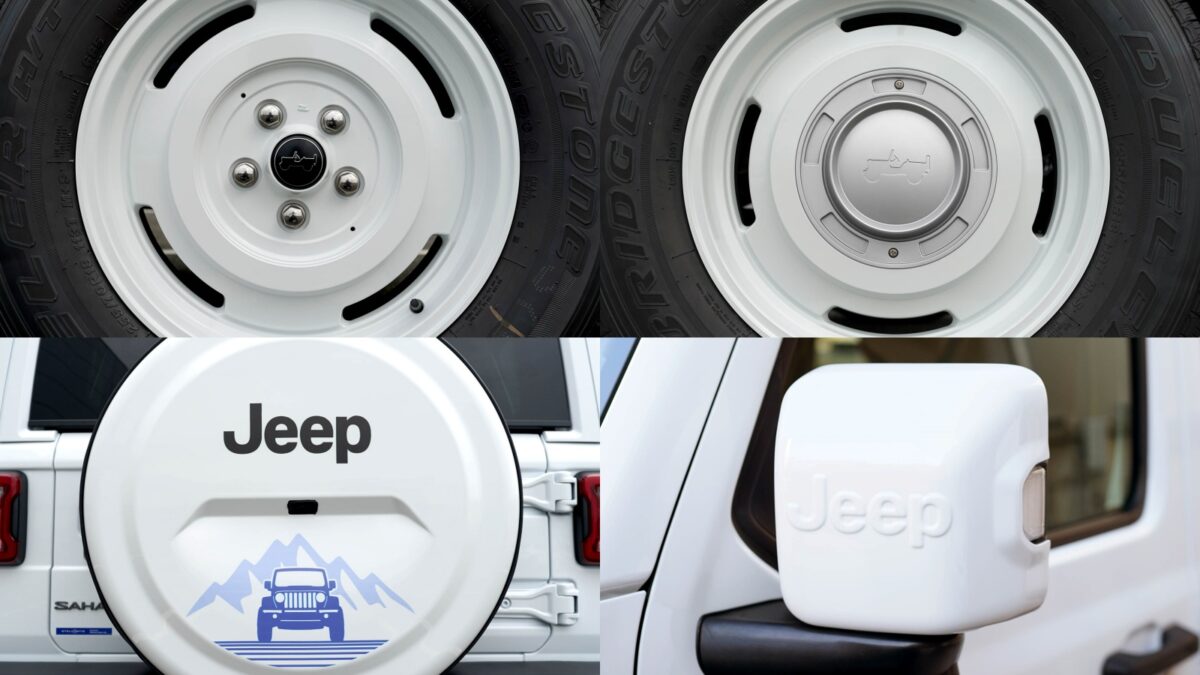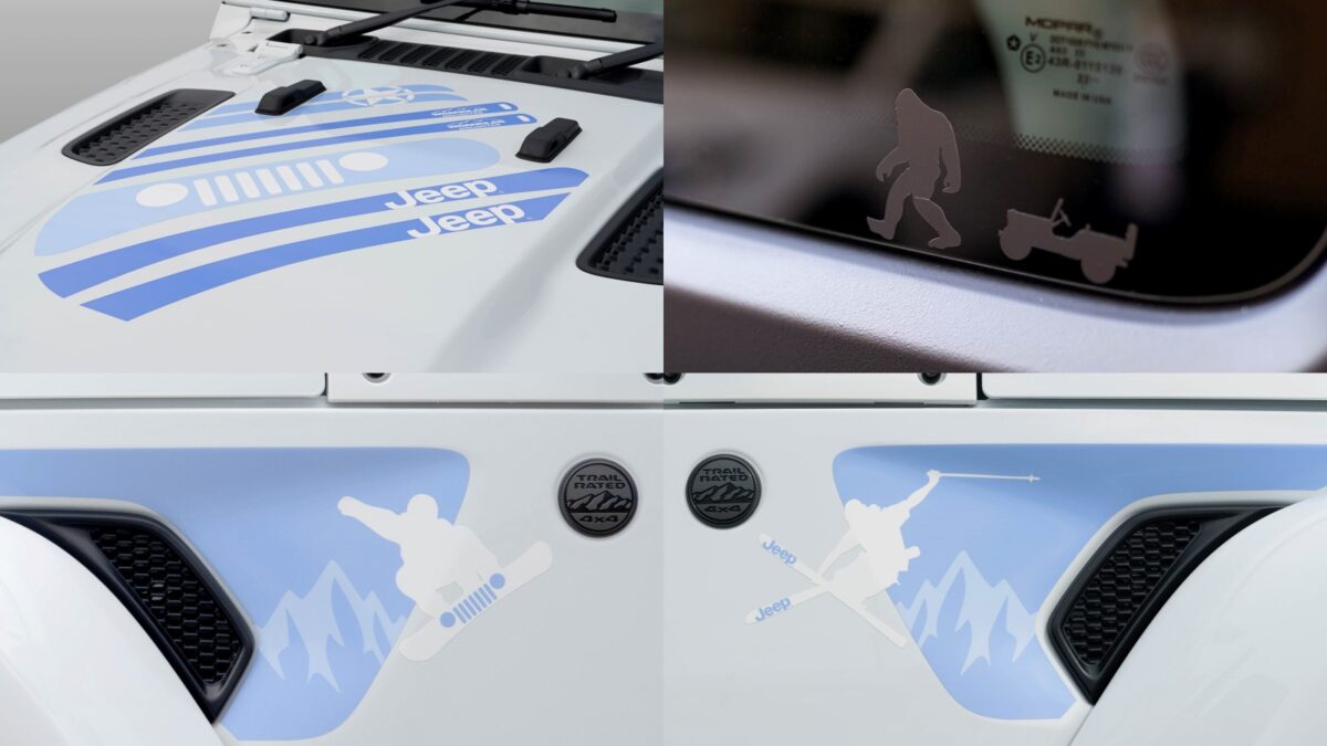 這款以Wrangler Unlimited Sahara為基礎、專為日本市場打造的限量版車型,原廠強調設計靈感來自雪地運動,除了全車採用雪白車色包含白色車頂與後視鏡,車身周圍還加入一些呼應主題的專屬車貼,例如引擎蓋上的車貼代表大型滑雪板和單板滑雪板,前葉子板兩側也有滑雪者和單板滑雪者的剪影,左後車窗則是出現了威利吉普車 (Willys MB) 與雪人的有趣圖案,每一處細節都充份展現出美國產品設計團隊的巧思。