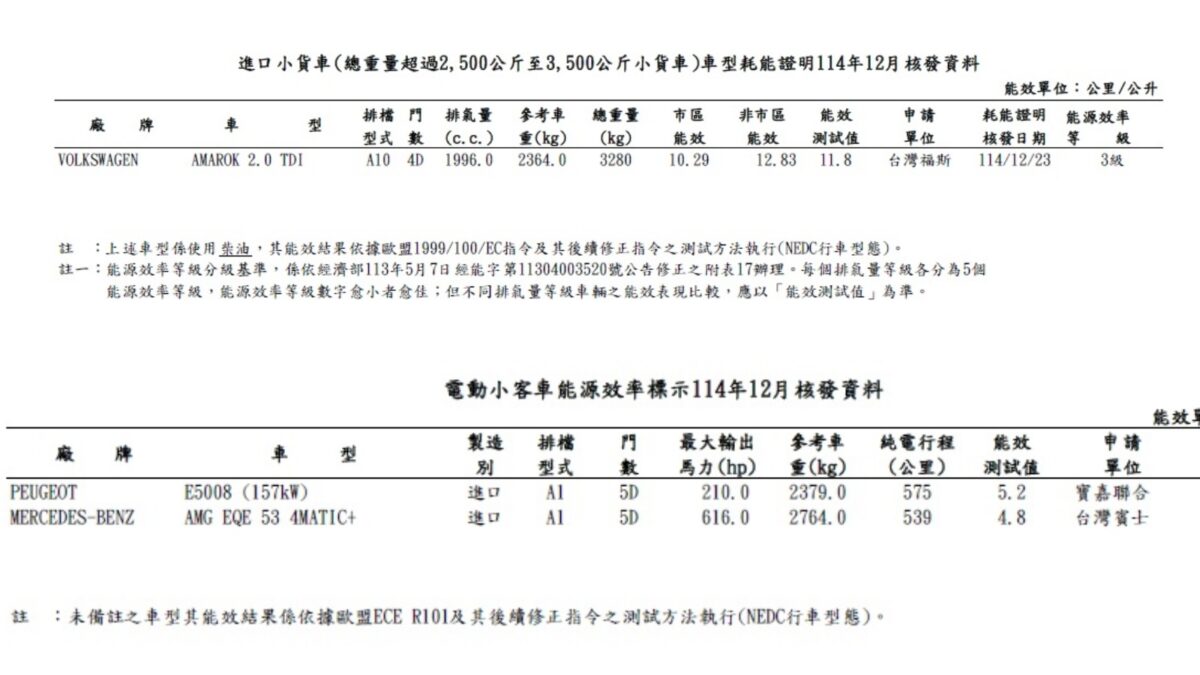 2026年剛開始不少新車已經蓄勢待發,根據能源署最新公布的12月油耗/能耗測試成績,除了有近日正式發表、統一搭載2.5升油電動力的大改款Toyota RAV4,預計今年第二季推出的Alfa Romeo Junior,也完成油電車型的送測作業。值得關注的還有原本只規劃3.0升柴油車型的Amarok,這次送測的是2.0升柴油車型,電動車部分則有Peugeot E-5008、EQE SUV AMG 53 4Matic+搶先揭露能耗表現。