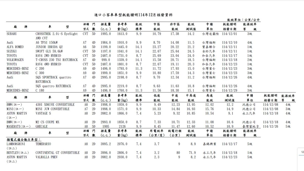 此外,先前在2026台北車展亮相的BMW M2 CS、Mini JCW Cabrio,也在這份送測名單中出現,前者搭載3.0升直六雙渦輪引擎,經過強化後可繳出530匹馬力、66.3公斤米扭力,平均油耗落在10.6km/L。後者跟JCW三門掀背車一樣搭載2.0升四缸渦輪引擎,具備231匹、38.8公斤米的輸出實力,雖然是性能取向的車型,但平均油耗14.9km/L仍優於預期。