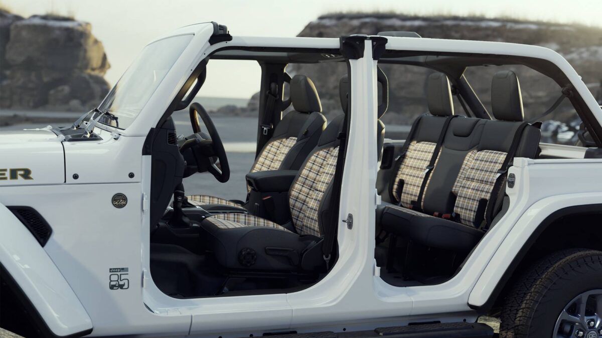 Wrangler 85週年紀念版最引人注目的亮點,無疑是其極具話題性的格紋內裝設計,Jeep此次以「Americana heritage」為核心概念,將象徵勤奮傳統、戶外自由與經典風格的格紋元素,全面導入車室之中。