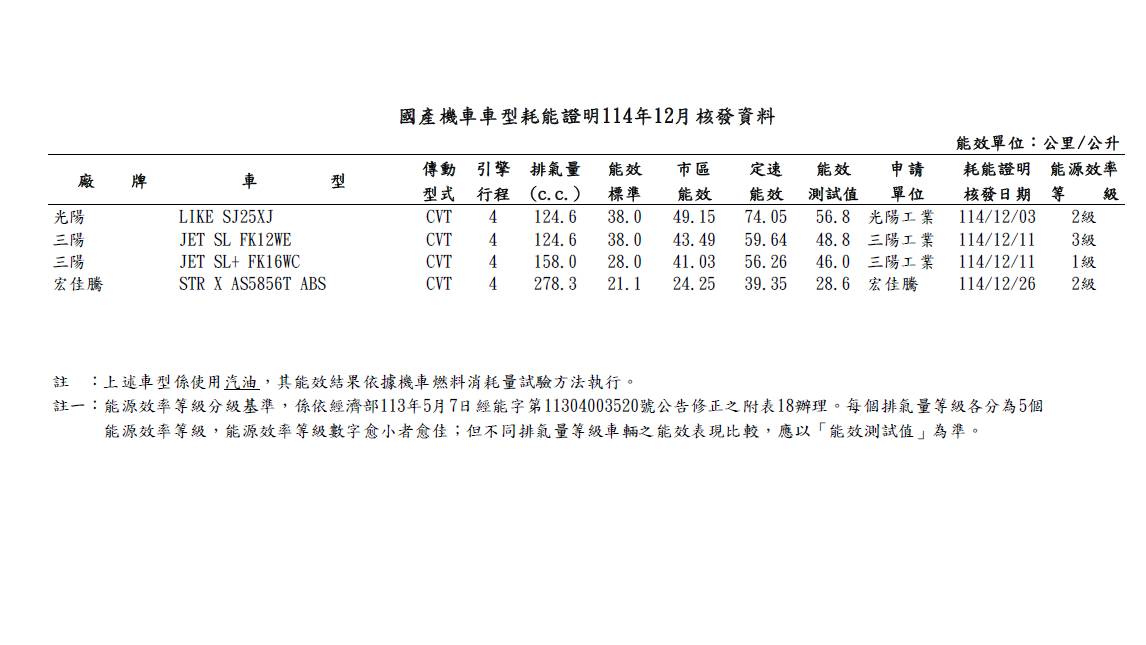 就在巫苡萱牽新車、Jet SL+ SuperC話題持續升溫之際,能源署公布的2025年12月耗能測試中,也出現了新的Jet SL與Jet SL+車型資料。從登錄內容來看,包含124.6c.c.的Jet SL(代號FK12WE)與158c.c.的Jet SL+(代號FK16WC),油耗表現皆比現行販售車型略有進步。