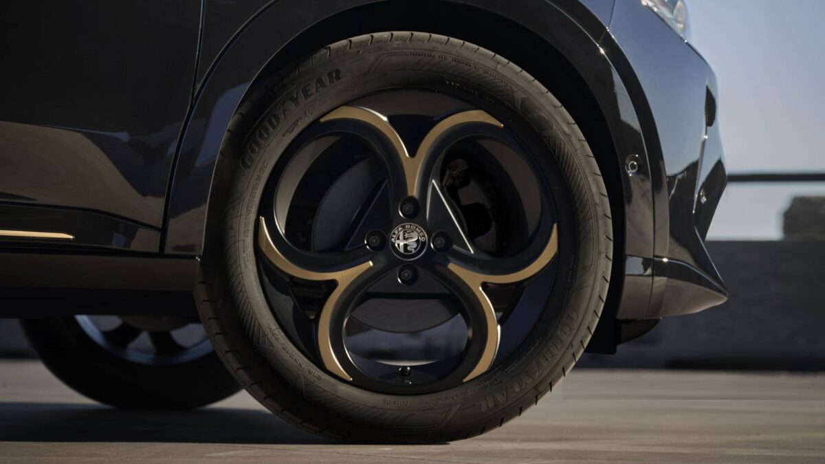Junior Ibrida Intensa在外觀上導入大量Intensa系列專屬設計元素,以亮黑色為基調,搭配金色細節點綴,營造出強烈且富層次的視覺對比,車頭採用融入「Biscone」蛇形圖騰的Scudetto盾型水箱護罩,並以車身同色處理,使整體線條更加俐落且具整體感,同時提升質感與存在感,足下配置18吋鋁合金輪圈,輪圈表面施以金色塗裝,進一步呼應Intensa主題,兼顧SUV的力量感與Alfa Romeo一貫的優雅氣質。