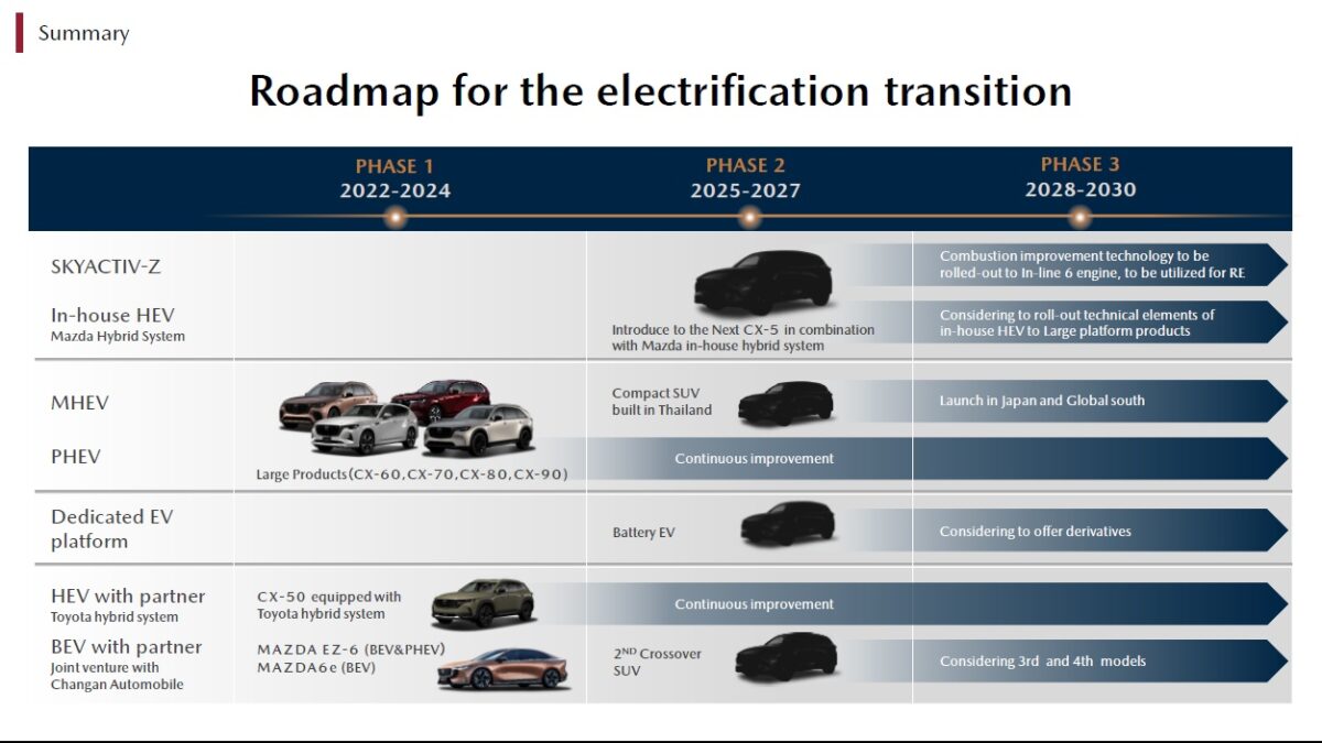 事實上,Mazda目前確實不急於推出自主開發電動車,因為在與長安汽車的合作下,近年已經陸續發表純電房車EZ-6、純電休旅EZ-60,並分別以Mazda 6e、CX-6e之名銷往歐洲市場。同時Mazda曾表示日本防府工廠升級後能允許不同動力的車型混線生產,不需要額外建立專門生產電動車的產線,因此可以隨時依據市場變動調整不同車款的生產比重,即使自主開發電動車延後推出也不會影響產線利用率。