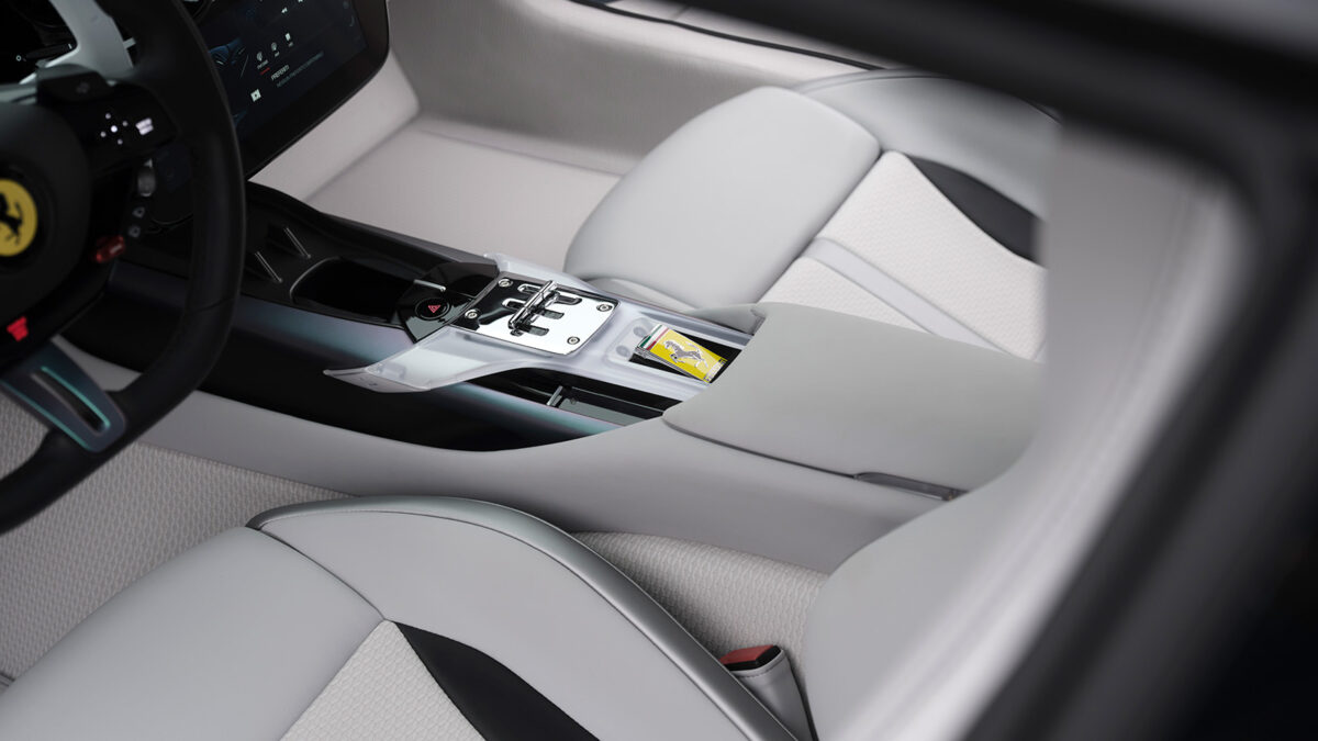 座艙工藝則由Dahye Jeong重新詮釋傳統馬尾毛編織。她的圖樣被導入座椅、地毯與多處軟質包覆,並透過韓國公司開發的3D立體面料呈現,據稱也是Ferrari首次採用這類新材質。同一圖樣也以網印方式出現在玻璃車頂,讓光線穿透時產生影與投射的層次變化,同樣屬於品牌首見。更具標誌性的是,儀錶台整合一件以蒙古馬尾毛手工編織的藝術作品,讓作品直接成為內裝構件之一,背後更需要Ferrari設計與研發團隊共同協作,才能符合車用耐久與安全標準。