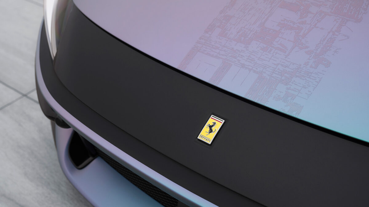 最後,車身外部塗裝線條由聲音與表演藝術雙人組GRAYCODE、jiiiiin接手,他們把Ferrari經典V12聲浪「視覺化」,將引擎聲轉譯成圖像語言,並由Maranello工匠手工呈現在車身上。為了強化立體層次,團隊使用與Yoonseul相同的漸層塗料、但色階更深一階,作為圖像深度處理手法,同樣被定位為Ferrari首次採用的新作法。