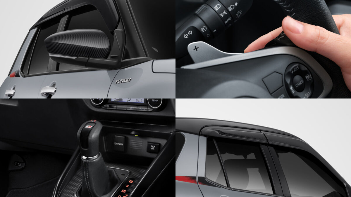 內裝同樣針對運動氛圍做加強。全車系座艙加入Gun Metallic金屬色點綴 (如門把飾板、中央鞍座、內裝側飾等),並將A柱與車內頂篷等處改為黑色鋪陳,呈現更一致的運動化調性。多媒體配備方面,Raize車機新增支援Android Auto與Apple CarPlay,而1.2G車型更把原本8吋螢幕升級為9吋。在GR Sport設定上,亦以7吋數位儀表、9吋中控觸控螢幕溝通,透過GR Sport配備堆疊。