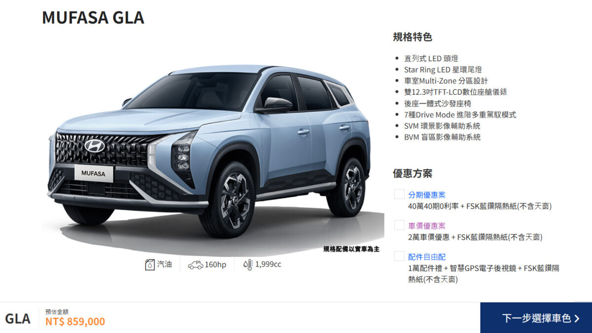 Mufasa去年5月在國內發表上市,開出GLA、GLB以及GLC三種不同車型,當中GLA為入門設定,建議售價87.9萬元,而GLB則是89.9萬,並有再往上加5萬、售價94.9萬的GLC等級。但是,近期觀察Hyundai官網購車頁,南陽實業悄悄更新Mufasa的車型售價,GLA進行價格調整來到85.9萬元,比起之前有2萬元降幅。