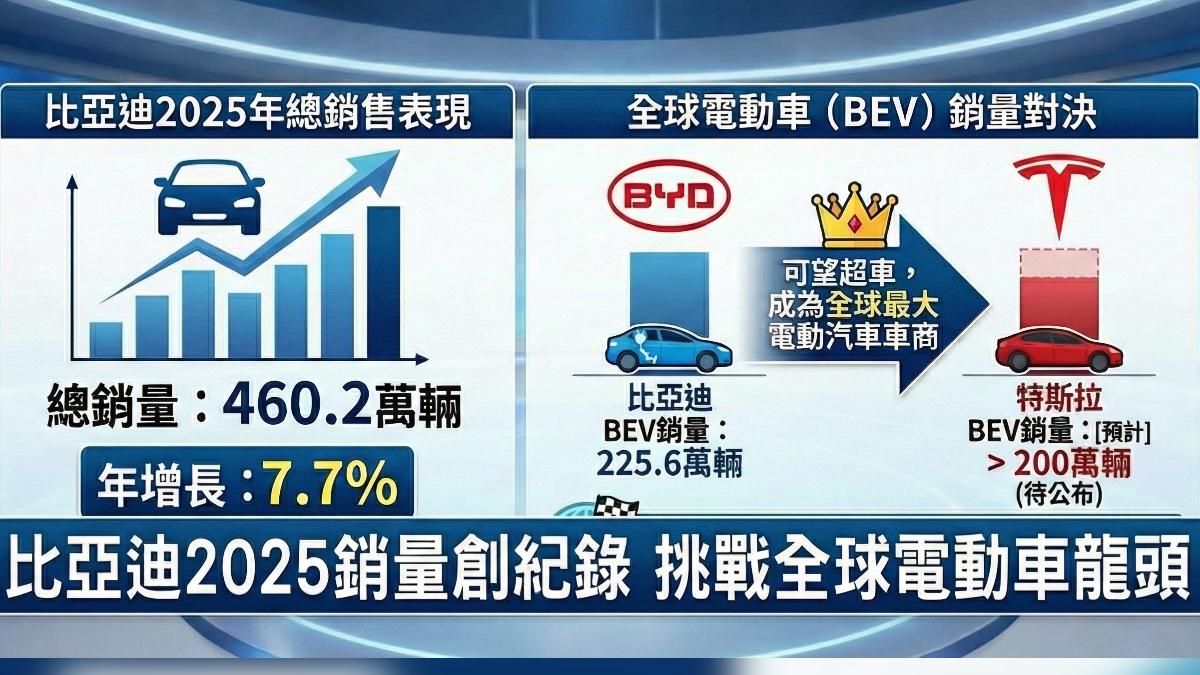 比亞迪近期攜手央視展現自家電動車科技,以超狂排場細數旗下車款優點。跨年之際公布2025年銷售資料,全年共賣出460.2萬輛,年增長7.7%,其中電動車高達225.6萬輛,這樣的數字可望一舉超越特斯拉,成為全球最大的電動汽車車商。補貼政策的影響不只比亞迪受惠,小米同樣表現亮眼,2025全年銷量突破41萬輛。