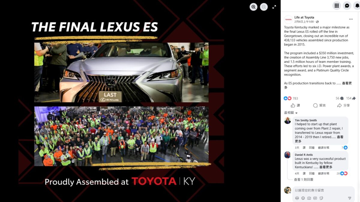 事實上,自從新一代Lexus ES發表後,市場便不斷傳出原廠將調整美國產線布局,把Lexus的生產重心轉移到印第安納工廠,而原本負責Lexus ES組裝的肯塔基工廠則會關閉產線。因此,隨著最後一輛Lexus ES正式下線,肯塔基工廠也同步宣布完成歷史任務,並表示自2015年投產以來,已經生產多達438,133輛Lexus ES,橫跨第六代與第七代車型,還六度獲得J.D. Power工廠品質獎肯定,同時為當地帶來約3,750個工作機會。
