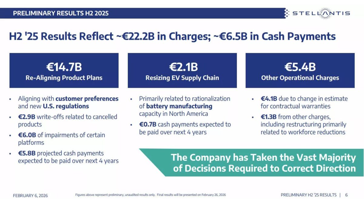 此次認列的約262億美元(約新台幣8,300億元)減損費用,主要與縮減電動車計畫、取消產品項目、調整電池供應鏈與生產規模有關,雖然其中約三分之二屬於非現金項目,但仍有約65億歐元(約新台幣2,433億元)為未來四年需實際支出的現金成本。