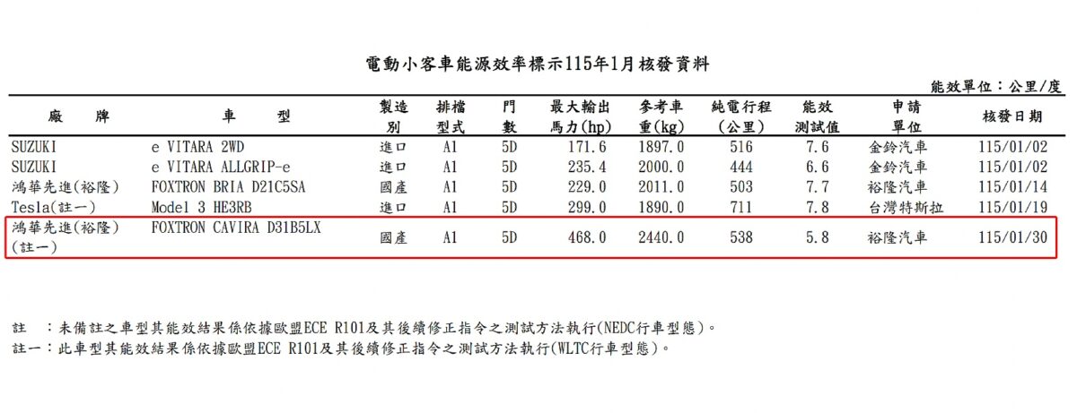 根據經濟部能源署公布的能源效率標示,鴻華先進於1月底送驗車型名稱為「Foxtron Cavira D31B5LX」的電動新車,最大馬力輸出來到468匹,並具有538公里純電行駛里程,以及每度電行駛5.8公里 (5.8km/kWh) 平均能效。與先前Bria以NEDC測試方法進行認證不同,鴻華先進這次在Foxtron Cavira的能效標示申請中,採用WLTC測試標準,相對更接近實際的能效以及續航力狀況。