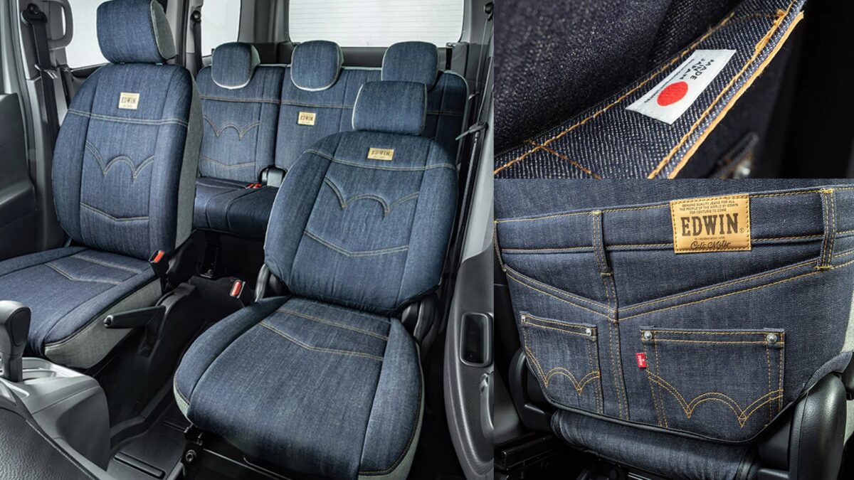 其中外觀最大亮點,是以EDWIN代表色所調配出的專屬「EDWIN BLUE」雙色塗裝,並在車身雙色交界處加入模擬牛仔褲縫線意象的專屬針線風格飾條,再搭配14吋Moon Chrome鍍鉻輪圈與165/80R14復古胎。內裝則是直接將EDWIN用來製作牛仔褲的丹寧布料套用在前後座椅,不只強調布料不易褪色,還能兼顧長期使用的耐用度而且不易沾染衣物,就連縫線、前座椅背後面的口袋,甚至是皮標、補釘釦等細部作工,都是比照EDWIN牛仔褲辦理。