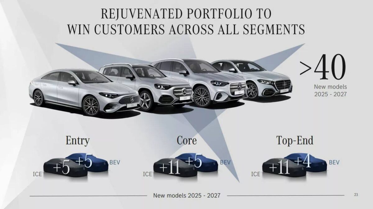 簡單講就是,在歐盟燃油車禁令取消後,賓士沒有要把雞蛋全押在電動車上,而是用更現實的節奏,把主力級距(Core)、入門產品(Entry)與高端旗艦(Top-End)一起補強,靠「新車密度」去撐住聲量與銷售。
