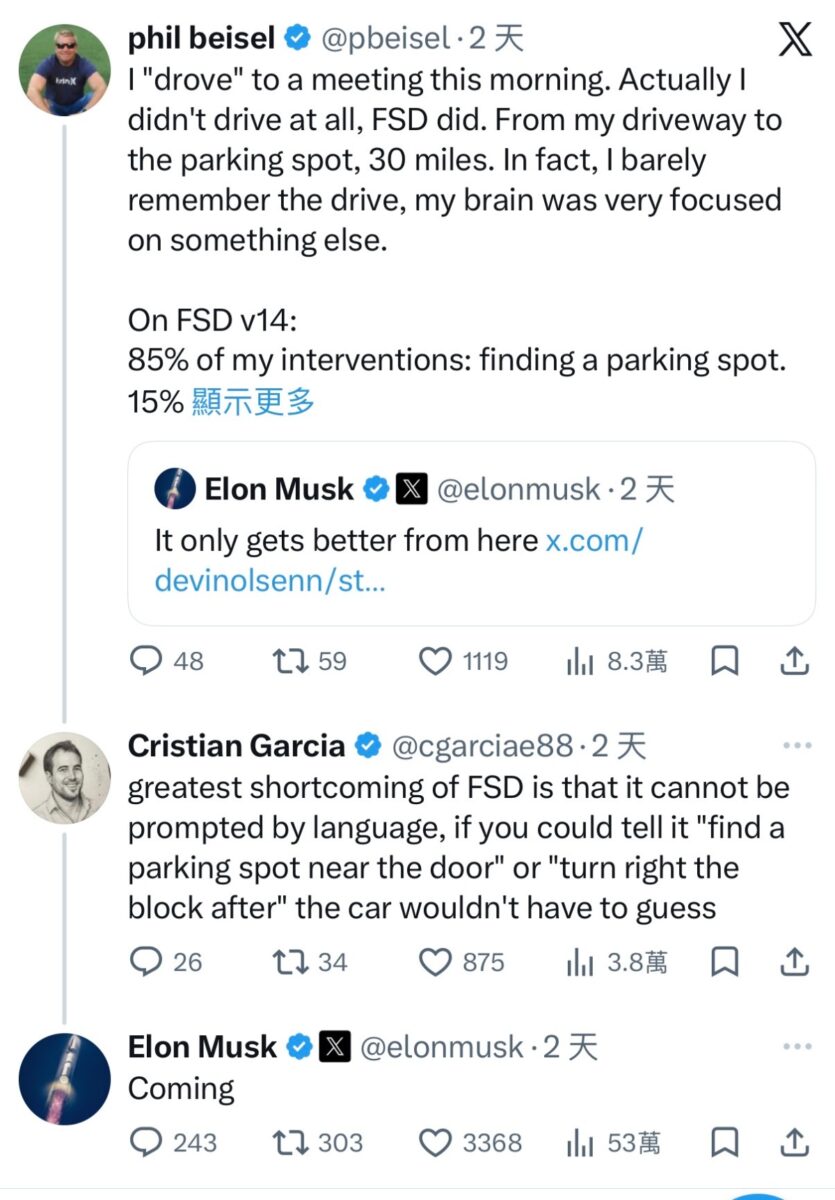 Phil Beisel的貼文也引來Google DeepMind工程師Cristian Garcia回覆,Cristian Garcia表示,FSD目前最大的缺點,在於它無法透過語音方式介入控制,如果能夠直接下達類似「在門口附近停車」或者「下一個路口右轉」等指令,車輛就更可以更貼近車主喜好的前往目的地,或者停在偏好的停車場中。這個留言,直接讓Elon Musk回應「Coming」,代表Cristian Garcia的期待將很快實現。