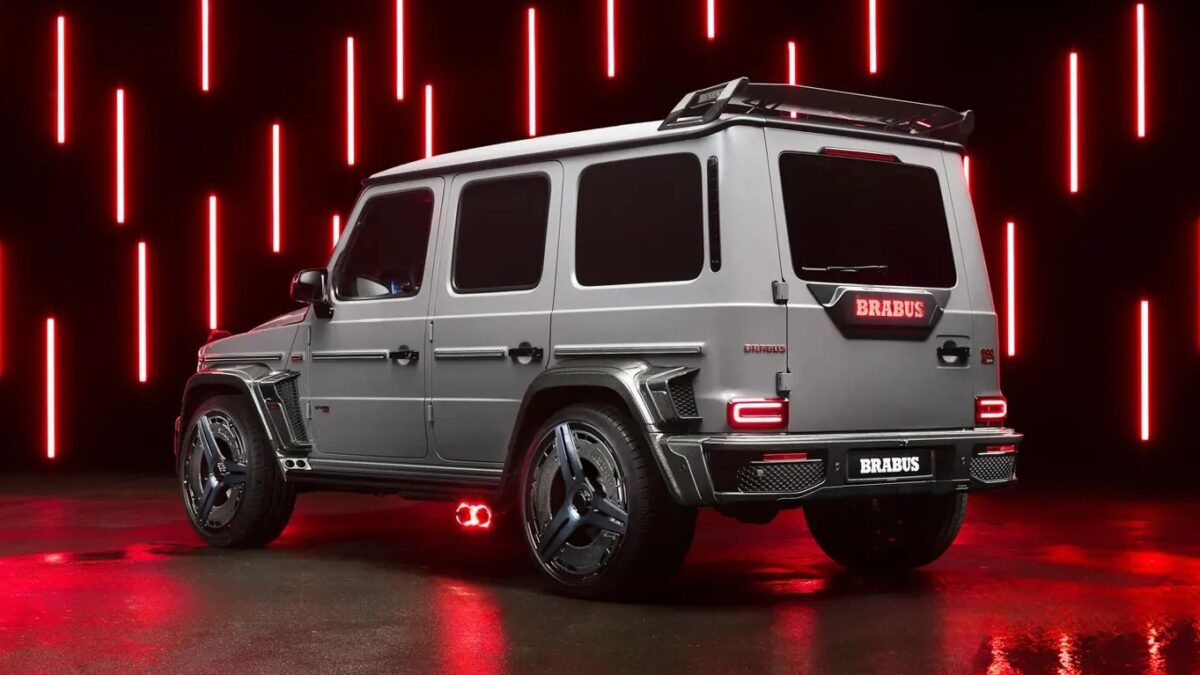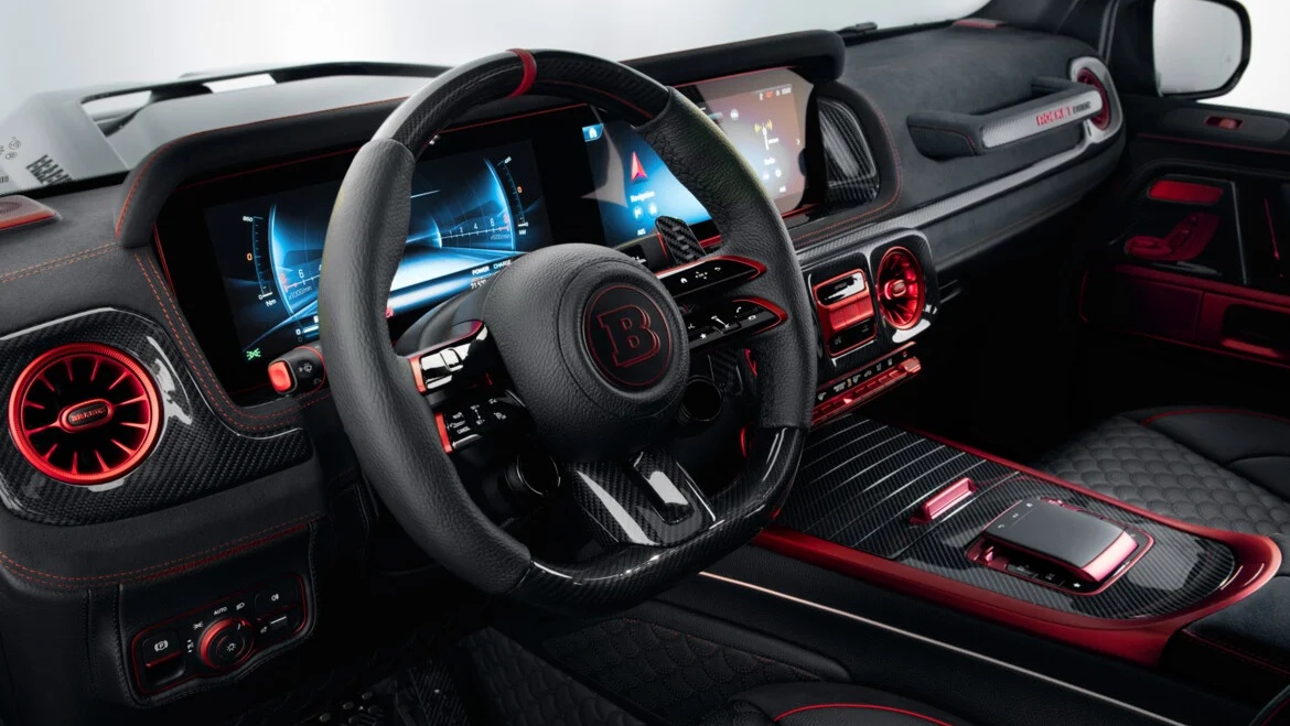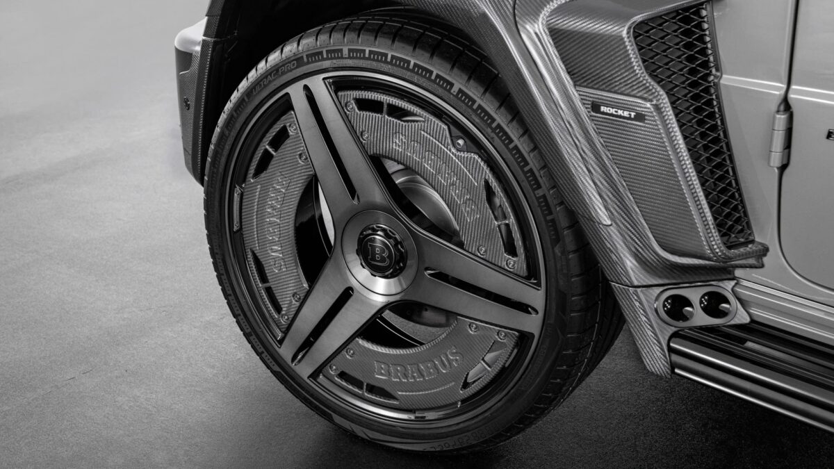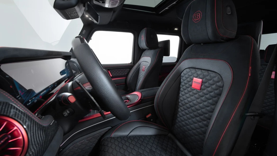 同樣搶眼的還有高達24吋的Brabus Monoblock II EVO鍛造輪圈,不僅採用經典的三輻式設計,兼具高剛性和輕量化效果,還能透過選配加裝碳纖維空力葉片飾蓋,來減少輪拱內的不規則氣流,進而提升高速行駛時的穩定性,前後配胎規格則分別為295/30 ZR24、355/25 ZR24。位於兩側後輪前方的Brabus Rocket高性能不銹鋼排氣系統則設有排氣閥門,可控制聲浪和排氣流量,排氣管尾段還包覆碳纖維飾板甚至內建紅色氣氛燈,散發出肅殺的氣息。