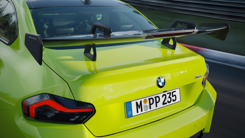 而針對M2車系推出的M Performance Track Kit,核心在於大幅強化車輛的下壓力表現。前軸空力佈局上,就包含可手動調節的前分流器,與前擴散器整合為一,搭配輪拱擴散器以及位於引擎油冷卻器下方的進氣口設計,另外車頭兩側配置的空力導流板也能進一步增加前輪抓地力。此外,車上還搭載源自賽車的天鵝頸式尾翼,具備獨特的賽道模式,尾翼可向後移動50毫米,並具備多段調整機能,提升空氣力學效率以及後軸下壓力。