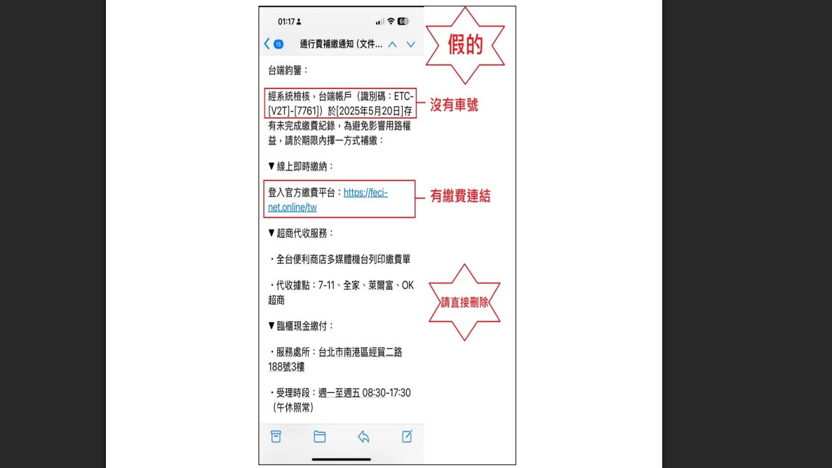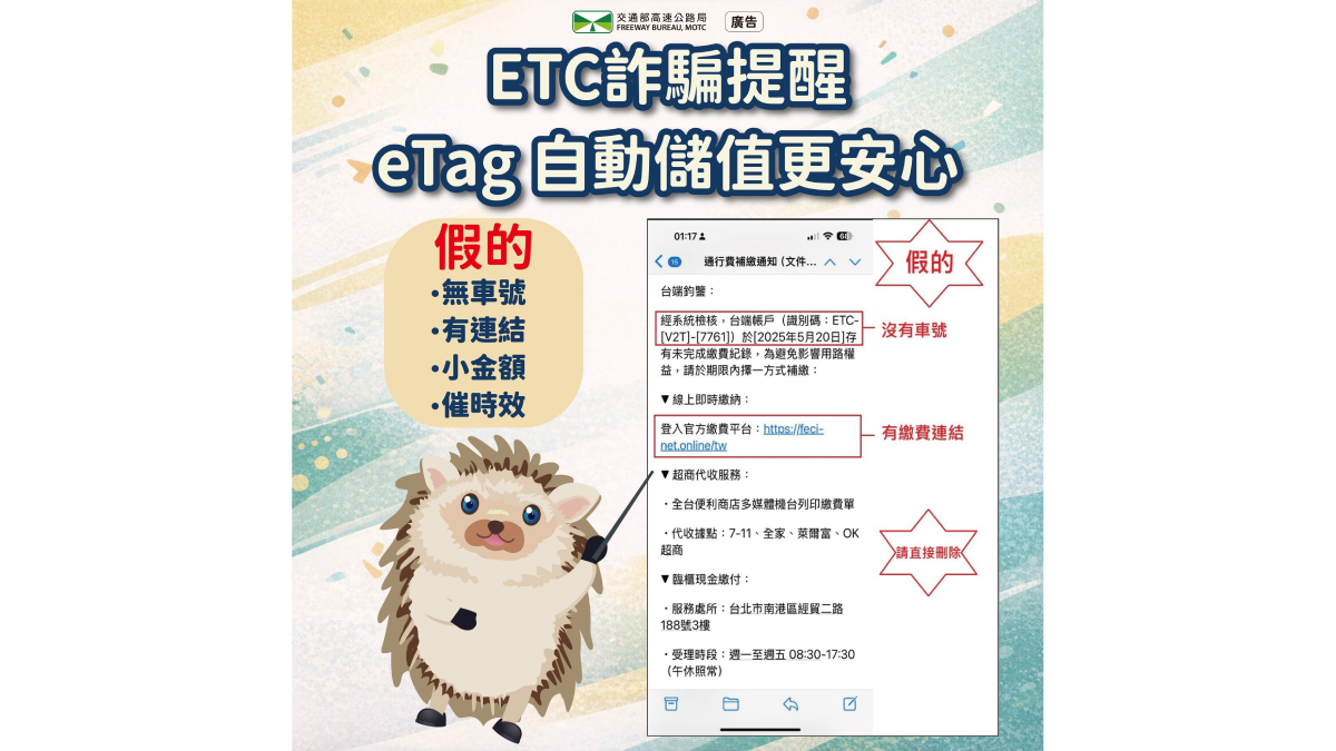 交通部高公局指出,目前ETC詐騙常見的手段包含「系統動作型」、「停車業務型」、「費用與限制型」,像是刻意編造37、40、46元等小額欠費 ,並利用「今日午夜前須繳費」或滯納金等法律後果,來誘導民眾點擊連結。因此高公局提醒,只要看到「無車號、有連結、小金額、催時效」這四大特徵,請直接刪除訊息。因為真正的ETC通知絕對會明確標註車牌號碼,如果訊息裡沒看到自己的車號,卻出現可疑連結、不到50元的小額欠費,並催促你立即處理,這百分之百就是詐騙陷阱。