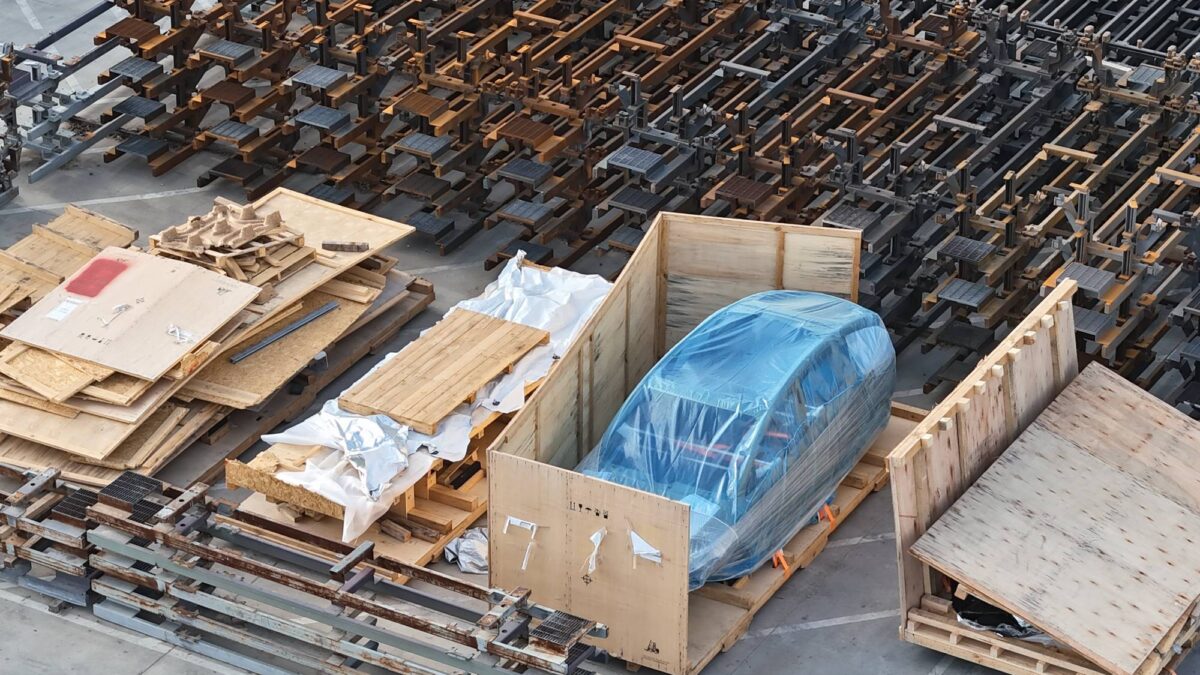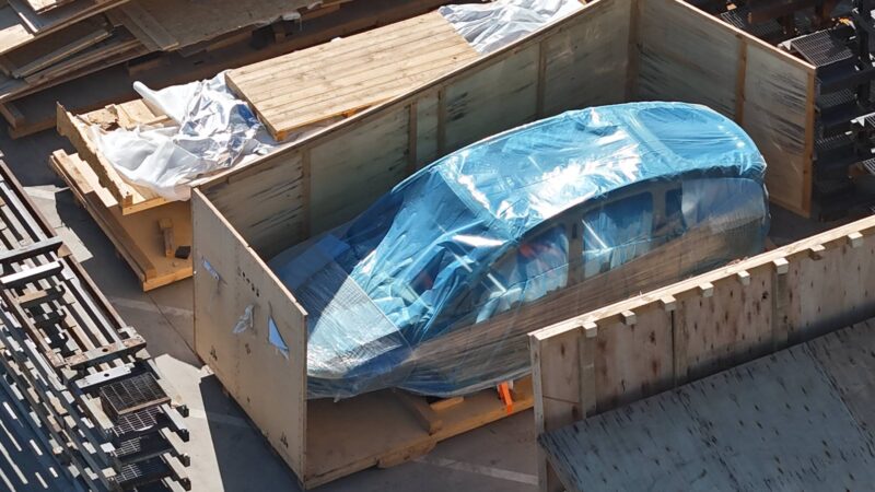 從空拍畫面來看,該車體被包覆在藍色塑膠與木箱中,雖然尚未組裝完成,但整體輪廓與比例已經引起網友討論。最關鍵的特徵在於車身明顯比標準版Tesla Model Y更長,車窗比例與車頂線條也與中國市場的Model Y L高度相似。