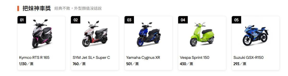 在話題性最高的「把妹神車獎」中,Kymco RTS R 165以1,130票暫居第一,展現強勁人氣。緊追在後的是SYM Jet SL+ Super C(760票),以及全新世代Yamaha Cygnus XR(501票)。